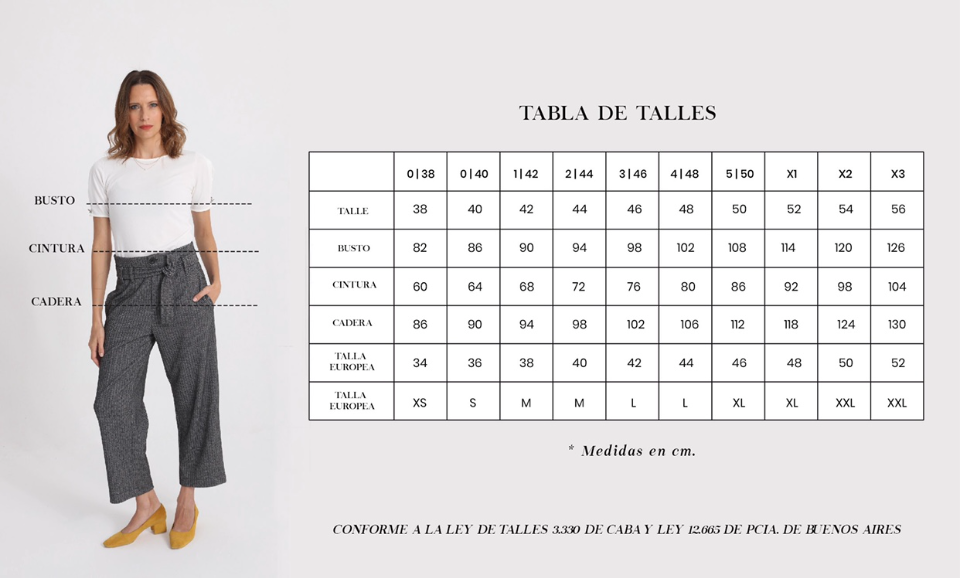 Las medidas básicas las encontrás en el enlace mas abajo. Tenés que tener en cuenta que las prendas de tejido ceden y las medidas son aproximadas.