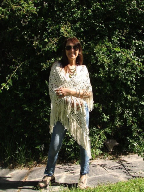 Chal de formato triangular con flecos, tejido a mano en hilo de algodón.Podés pedirlo en otro color de acuerdo a disponibilidad!